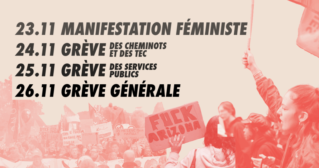 FR // Le gouvernement Arizona veut imposer une société du chacun pour soi, où seuls comptent la rentabilité et l’individualisme, où l’on casse les droits sociaux, où l’on divise, où l’on appauvrit. Le 14 octobre, nous avons ouvert une brèche : à nous de l’élargir le 24, 24, 25 et 26 novembre.